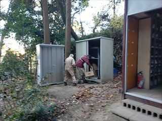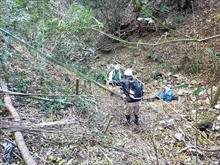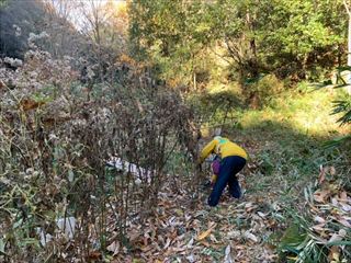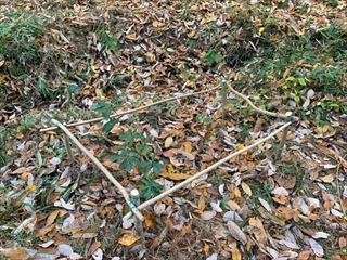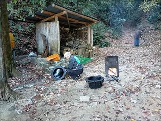 14名で竹炭焼き・バタフライガーデンの整備・拠点地周辺の整備・竹伐り(さともり事業対象)を行いました。バタフライガーデンの整備は落ち葉が一面に降り積もっています。夏の間に生い茂っていた草類が姿を消したところ、現れた実生二本を囲いました。竹伐りは、多目的広場への道の一番奥の郡南街道に当たった所の竹の伐採を行いました。