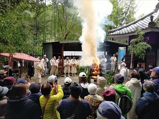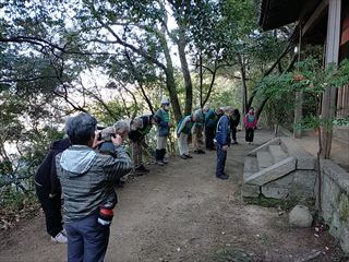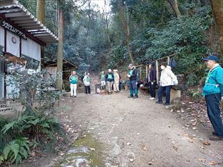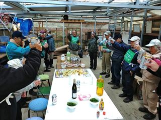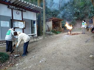寒い日の初出です、22名の会員が集まり新年の挨拶の後、参道の清掃と拠点地周辺の清掃を行い、糸吉神社に安全祈願の参拝をしました。6号倉庫でトン汁をいただき、お酒もはいり和やかな雰囲気になりました。また、寒い日はトン汁に限ると誰かが言っていました。 源氏の滝の不動堂では護摩法要が行われ、4,5名の会員が見学されていました。護摩壇は、ゆうゆう会が採取した薪と檜葉がもうもうと白煙をあげるなか、山伏の祈祷に圧倒されます。