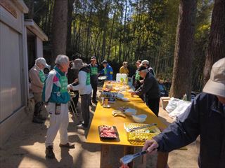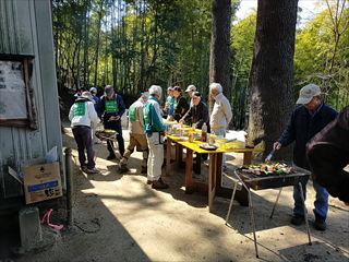朝晩寒い日が続きます、20名でバタフライガーデンの整備、拠点地周辺の整備、若竹伐りと竹伐り、里山保全推進員養成講座を行いました。若竹伐りはゆうゆうの道の両側、竹伐りはゆうゆうの森南側の竹を伐りました。午後は養成講座の受講生交えた懇親会です、椎茸のバーベキューは美味しくお酒も入り盛り上がりました。