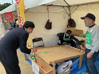 かたのにぎわいフェスタ2025がパシオン情熱Stadium(私部公園グラウンド)で開催され、今年も竹で作ったおもちゃ(竹トンボ、がりがりトンボ、ブンブンゼミ、知恵の輪、風車、カスタネット、カエル、竹笛)が当たるスマートボールを多くの方に楽しんで頂きました。※市長さんにも参加頂きました