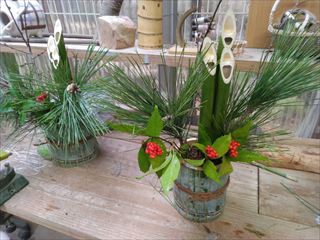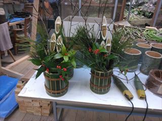 12/26(金) 本年最後の活動日で、恒例のミニ門松づくりをしました。一週間程前から、材料採取や持ち運んだ材料の加工等の事前準備を有志で行いました。会員の方や本年の里山講座の受講生が参加されました。手助けし合いながら、それぞれのミニ門松を作成しました。最後の写真は第49回交野市文化祭に出展した時の、文化祭応援メッセージカード(アンケート)で、展示した作品を高く評価する内容が数多くありました。