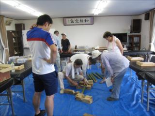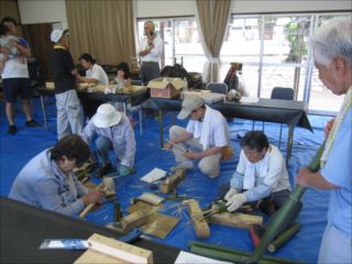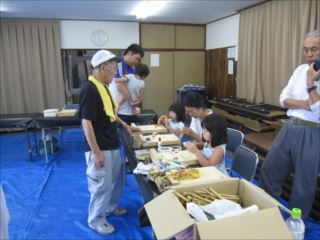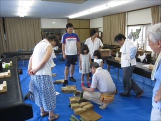 第76回クラフト教室がお盆休みの中10名(午前中の方も含めて)と神戸に住まいの5人家族が、HPを見て参加されました。ご主人が以前養成講座を受講したとおっしゃっていました。(家族は帰省中)子どもたちには、岡田リーダーがブンブンゼミ作りを教えてもらって楽しんで作っていました。大垣リーダーは交野児童会クラフト用のけん玉と花びん作りの講習を。 本日は活動前約1時間ぐらい集会所の周辺の草刈りをしました。