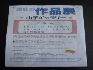 第78回クラフト教室が秋の好天の下、倉治区から1名含めて10名で自由作品を作りました。活動中、『趣味の作品展 山手ギャラリー』を10/21(日)山手集会所(東倉治)で初めて開催します。ゆうゆう会さんも作品を展示していただけませんかとお誘いが有りました。皆さんで相談して出品する事にしました。詳細は案内状を写真に撮りました。