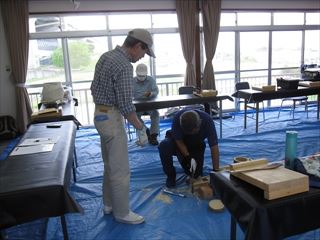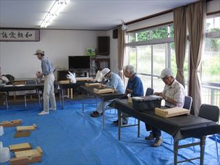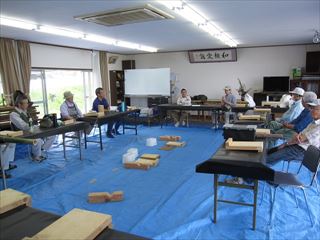第86回クラフト教室倉治区で常連さん1名含めて13名が参加しました。集会所の周りの田んぼは、早苗が植えられ窓を開放して、心地良い風を受けながらの作品作りでした。