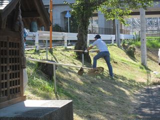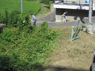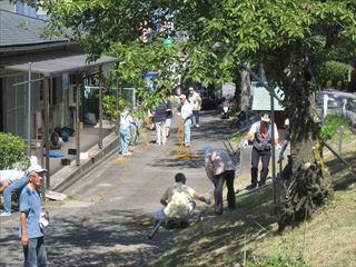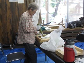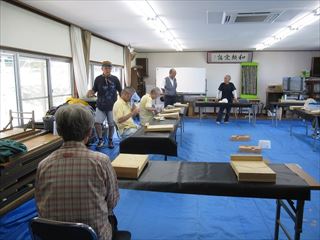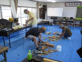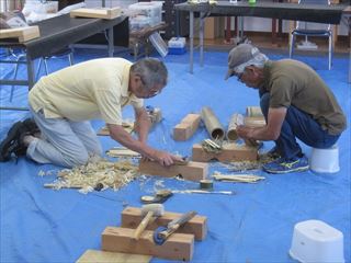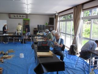 集合時間より皆さん早出して活動前、集会所の周辺と駐車場の草刈りと8/24(土)に東倉治区で行われる地蔵盆の会場準備のお手伝いをしました。今年度から区長が加茂さんに交代され、会員に紹介されました。猛暑日の中、集会所の中は空調が効いた中で 自由作品や8/23に行われる小学校クラフト教室のお土産にするガリガリトンボを作りました。般若心経を竹に彫った作品は、山本さんの大作です。