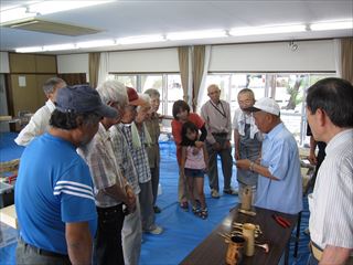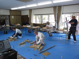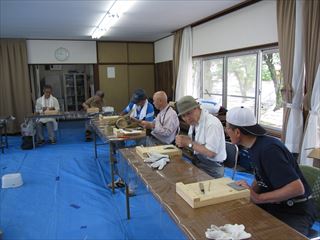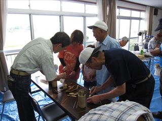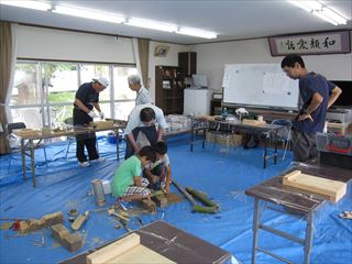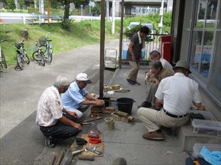 昨日と打って変わって猛暑でしたが、16名の参加。午前組が6名で少なくなりましたが終了前に親子ずれ4名が初参加と入れ替わりの多い一日でした。リーダーの指導で、高知県でしか取れない虎竹で耳かきを皆で作ったあと自由課題、ジョッキー、靴べら、鹿威し、箸等作りました。山手集会所の周りの草刈りも行いました。