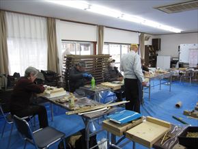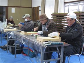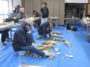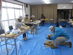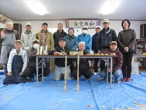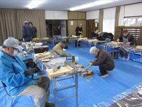 第69回クラフト教室が本年初めて行われました。14名参加して、外は厳しい寒さでしたが、集会所は暖房も効いて快適な環境で皆さん自由作品を作りました。また、チェンソー活動で使用する木製のクサビも作っています。