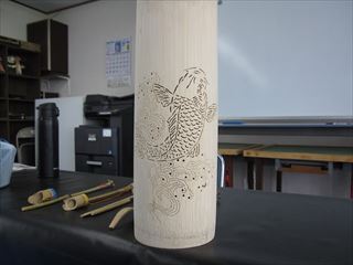 梅雨の真っただ中、今日も小雨が降って、活動開始時には出足が悪くいつもの人数の半数でしたが、時間と共に増えて13名(倉治区1名含む)になりました。ブンブンゼミの制作応援や、自由作品を作りました。鯉の作品は、中に電球を入れて点灯すると、泳いでいるように浮かび上がるそうです。 リーダーの作品です。