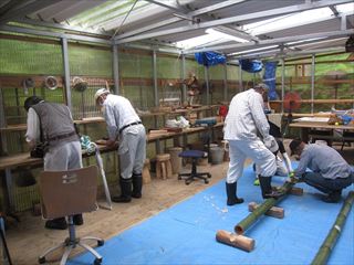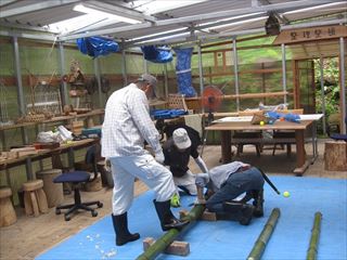 第125回クラフト教室が会員10名と会のHPをみて竹クラフト体験と竹灯籠を作りたいので竹材を欲しいと連絡が有り、守口市から、親子3人(小4の女の子)雨の中集まりました。会員は倉治区の祭りのスマートボールの調整と景品づくり。親子は、ブンブンゼミの制作体験。おみやげには、ポッカン、ガリガりクン等有難うございました。と喜んでもらいました。