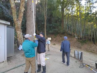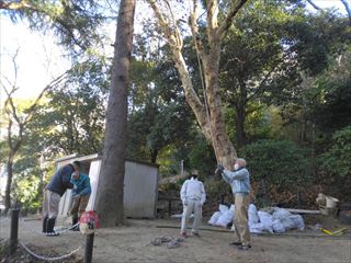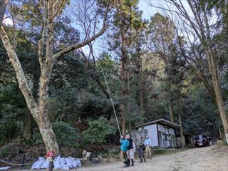 前日深夜から当日まで突風が吹き荒れて拠点地は多数の大きい枝が落下していました。クラフト活動は落下しそうな枝の除去作業から始まり正午までかかりました。地上から8メートル程高い2本の大きい枝をチルホールやスチールワイヤーを駆使して除去しました。①下に落ちていたスギの枝 直径約5cm 長さ約3m✕2本他 ②取り除いたプラタナスの枝 直径 約15cm 長さ10m✕2本他