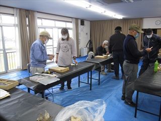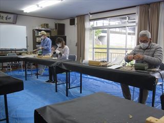 雨の予報のためか定刻時に4名。少し時間をおいて1、2、3名と集まり7名と少ないでしたが第109回クラフト教室を開きました。自由作品を作りました。中には、ピントが悪くて見にくいですが、ミニクリスマスツリー です。細かな作業ですが見事なできばえでした。