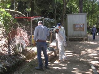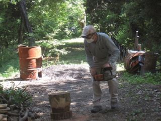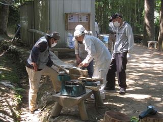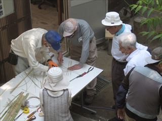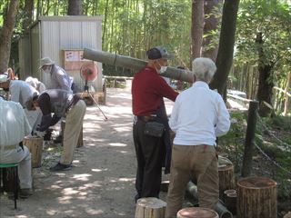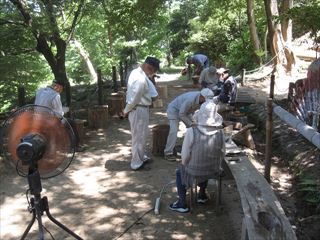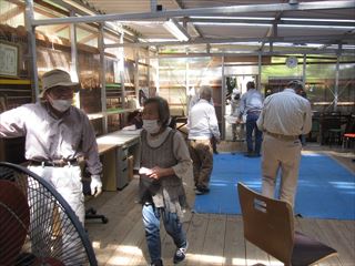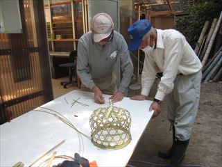 今日のクラフト教室は16名参加でした。快晴で気温も上がり、6号倉庫からみんな外にでて木漏れ日のなか、爽やかな天然クーラーを浴びながら竹ひごを作ってかご作り、刃物の研磨などなど自由作品を作りました。見学者もあり、昼食は野外のベンチで、新緑とオゾンを浴びながら頂きました。