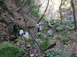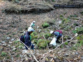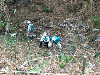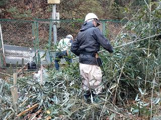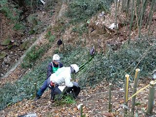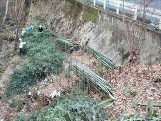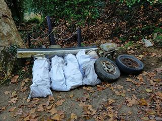 11名で竹伐り活動(さともり事業対象)を行いました。多目的広場への道の奥の郡南街道に突き当たったところのマダケをすべて伐採しました。また、長年にわたり郡南街道のフェンス越しに不法投棄された家庭ゴミが、川に流れ散乱しているためゴミ拾いも実施しました。拾ったゴミは渡辺さんの車で拠点地に運んでいただきました。タイヤは警察に届けその他のごみは分別する必要があり大変厄介です。