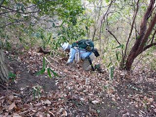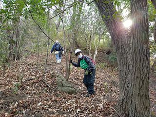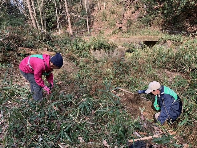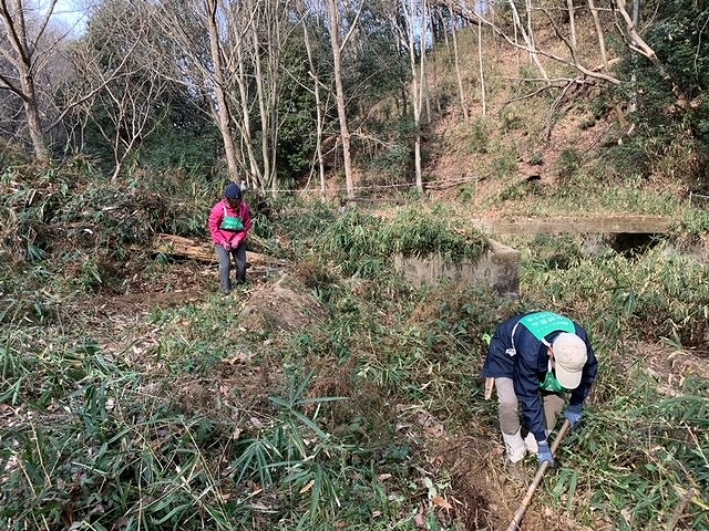 寒い朝です、13名で竹炭焼き・拠点地周辺の整備・バタフライガーデンの整備・若竹伐りを行いました。バタフライガーデンの整備は、敷地内の壊れた橋の架け替えと、植え付け予定の木(エノキ、サンショウ)の苗床の作成を行いました。若竹伐りは、石仏の道北側(二,三,四の谷)と小鉄塔の丘でほぼ小さな竹を伐り、三の谷の上部は殆どが急傾斜で小さな竹が沢山生えていて、4人で時間をかけてほゞ全て伐りました。