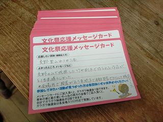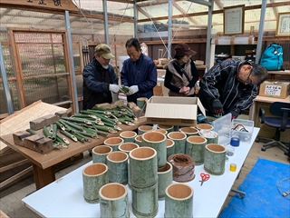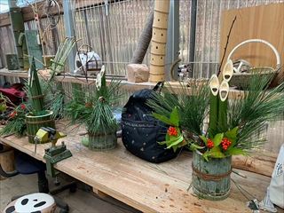 12/26(金) 本年最後の活動日で、恒例のミニ門松づくりをしました。一週間程前から、材料採取や持ち運んだ材料の加工等の事前準備を有志で行いました。会員の方や本年の里山講座の受講生が参加されました。手助けし合いながら、それぞれのミニ門松を作成しました。最後の写真は第49回交野市文化祭に出展した時の、文化祭応援メッセージカード(アンケート)で、展示した作品を高く評価する内容が数多くありました。